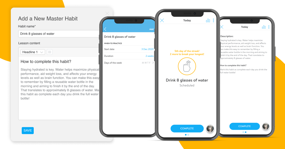Note: Trainers can schedule habits from both web and mobile, while clients view and track habits from their phones or so they can stay on track on the go