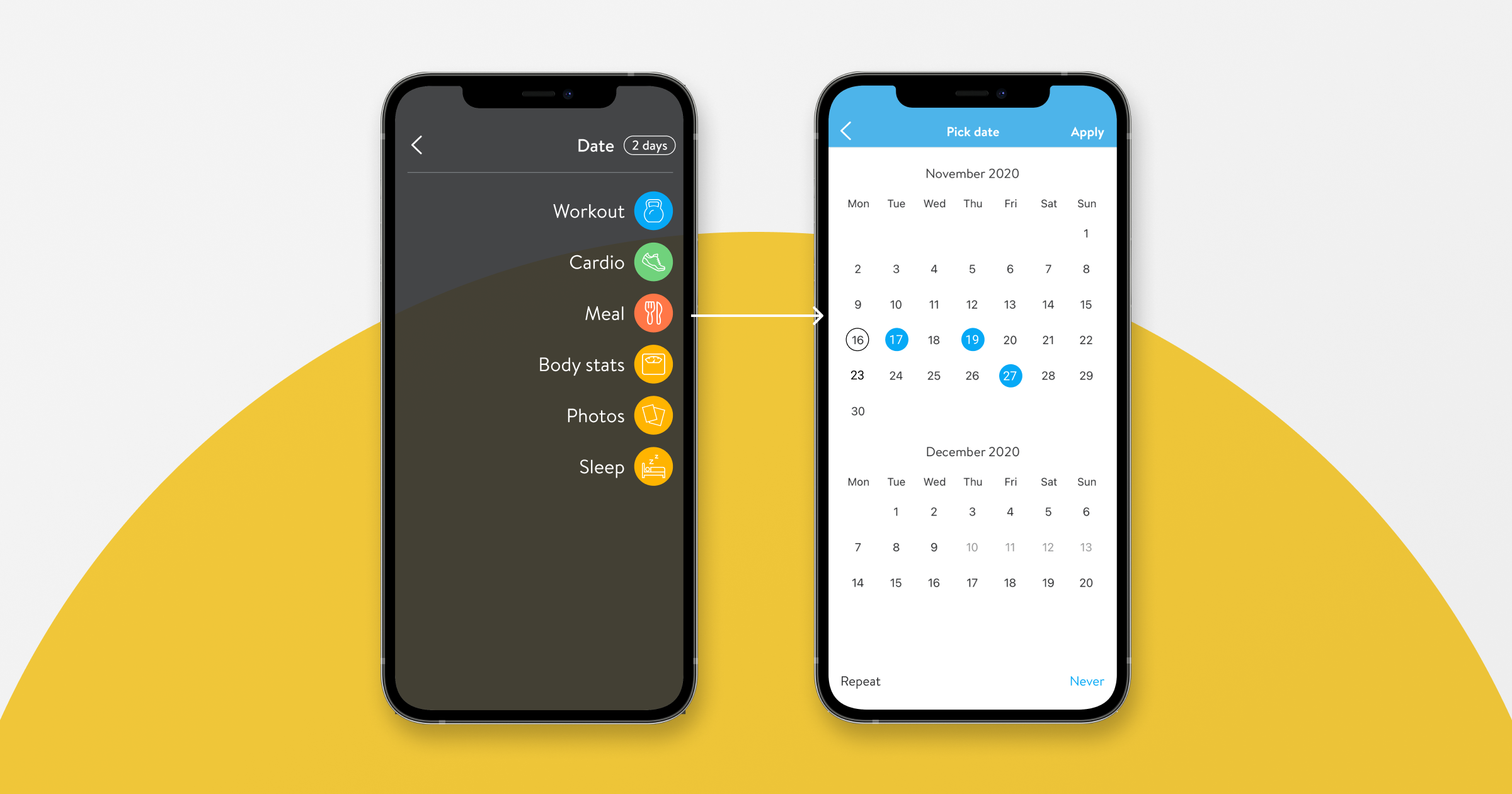 We’re bringing over a loved feature from the web to mobile to make scheduling a client’s calendar a total breeze. With the new repeat functionality, you and your clients can easily schedule workouts, cardio activities, progress photos and more to repeat at chosen day(s) of the week, for how long, and until when–saving you and your clients precious time.