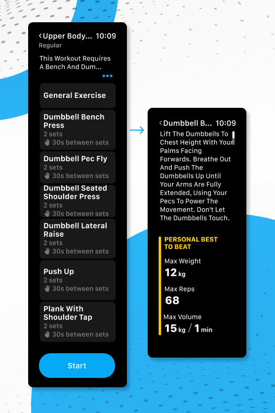 Clients can easily tap on a workout from their wrist to preview all of the exercises before starting a workout. Plus, they can go into each exercise as well to view the instructions and any personal bests.