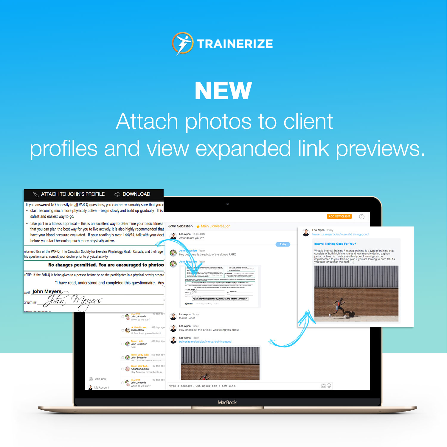 ATTACH TO PROFILE: Trainers also get the option to save images to their clients’ profiles. These will show up under the attachment section. Use this option whenever you want to save an important photo, such as a signed document or PARQ form.