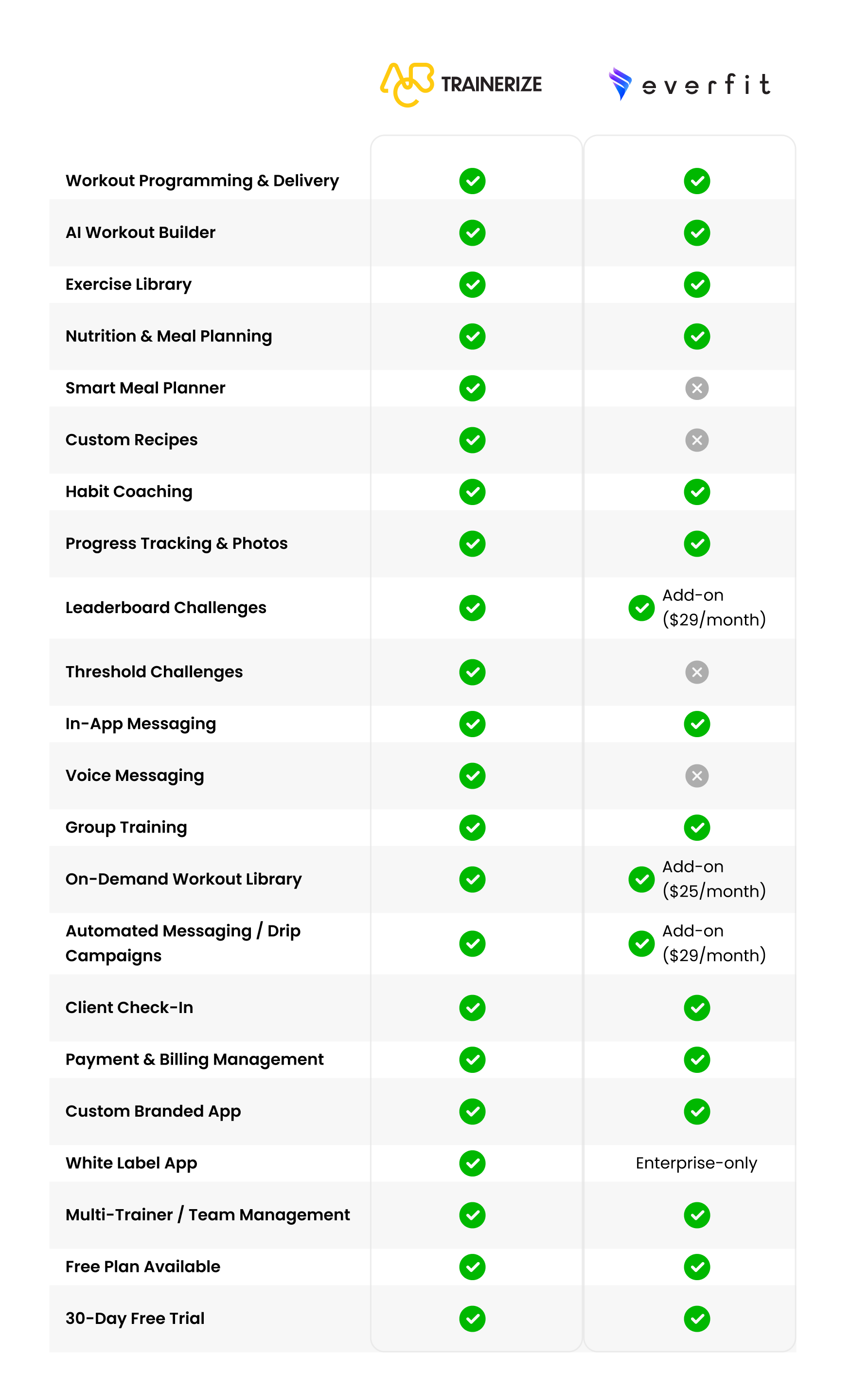 For new coaches, Everfit is a great fit. For studios and growing businesses, the total cost of ownership on ABC Trainerize tends to be more predictable.