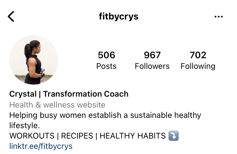 Crystal does an awesome job of including a clear “what she does” line off the top. She’s also doing great by not using hashtags and @mentions in her bio—both of these will lead people away from your profile, and you want them to stay! Crystal should add a line about her services and social proof, to help lead people to the link.